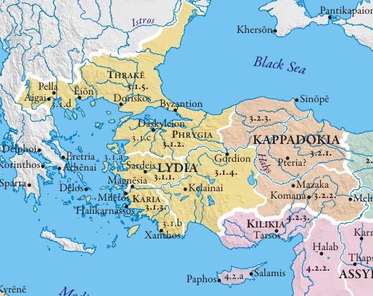 The Kingdom of Lydia existed from about 1200 BC to 546 BC. At its greatest extent, during the 7th century BC, it covered all of western Anatolia. In 546 BC, it became a province of the Achaemenid Persian Empire, known as the satrapy of Lydia or Sparda in Old Persian. In 133 BC, it became part of the Roman province of Asia.
